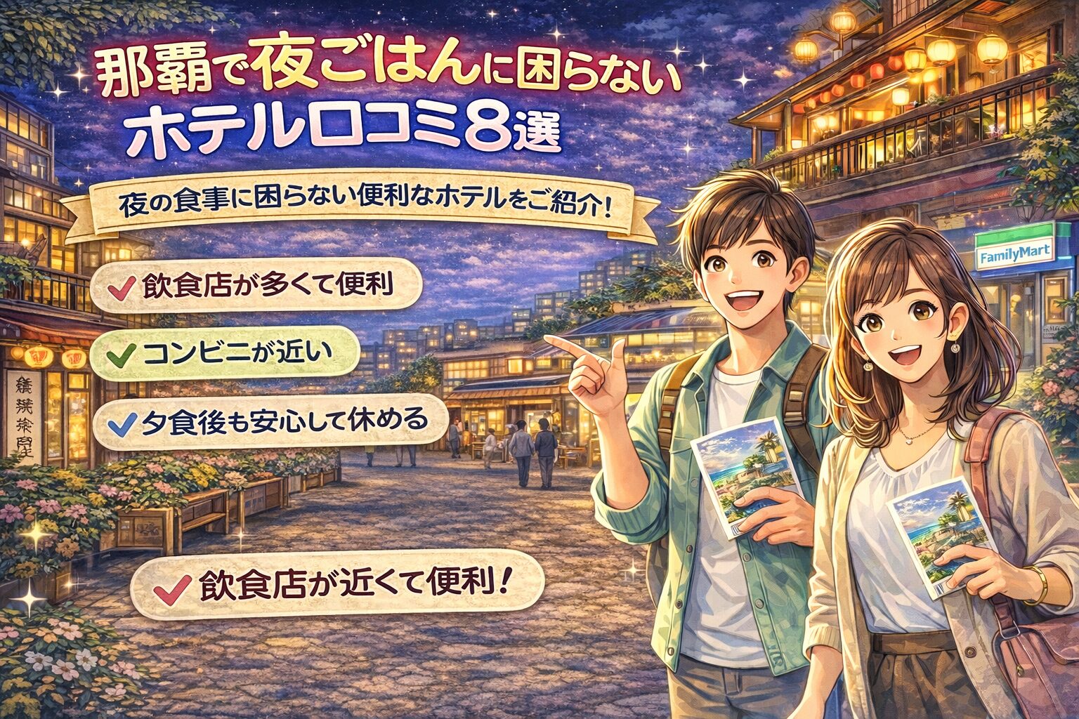 そこでこの記事では、「夜ごはんに困りにくい=飲食店が多いエリアに近い」 を基準に、ホテルを8つまとめたよ〜◎
